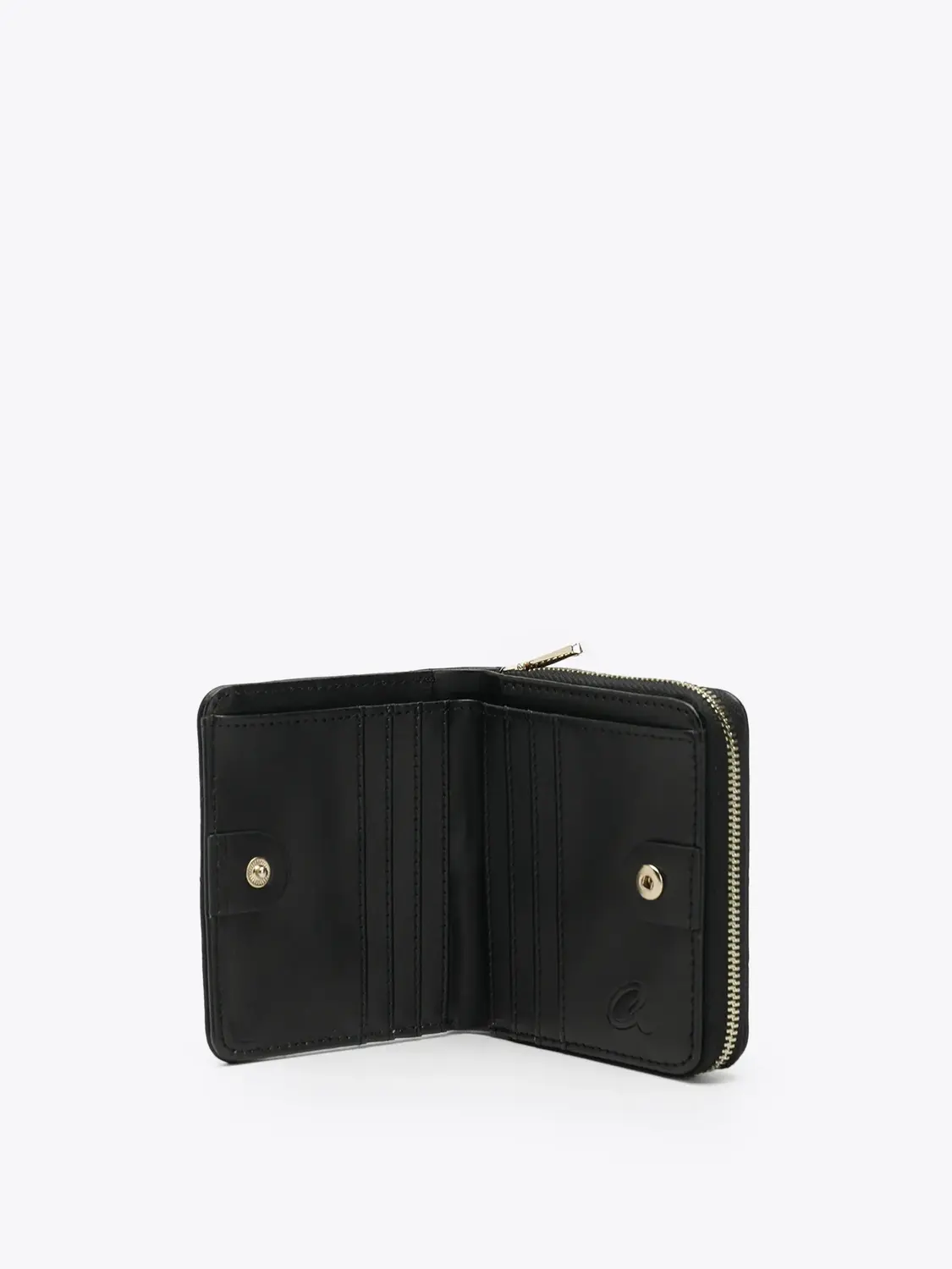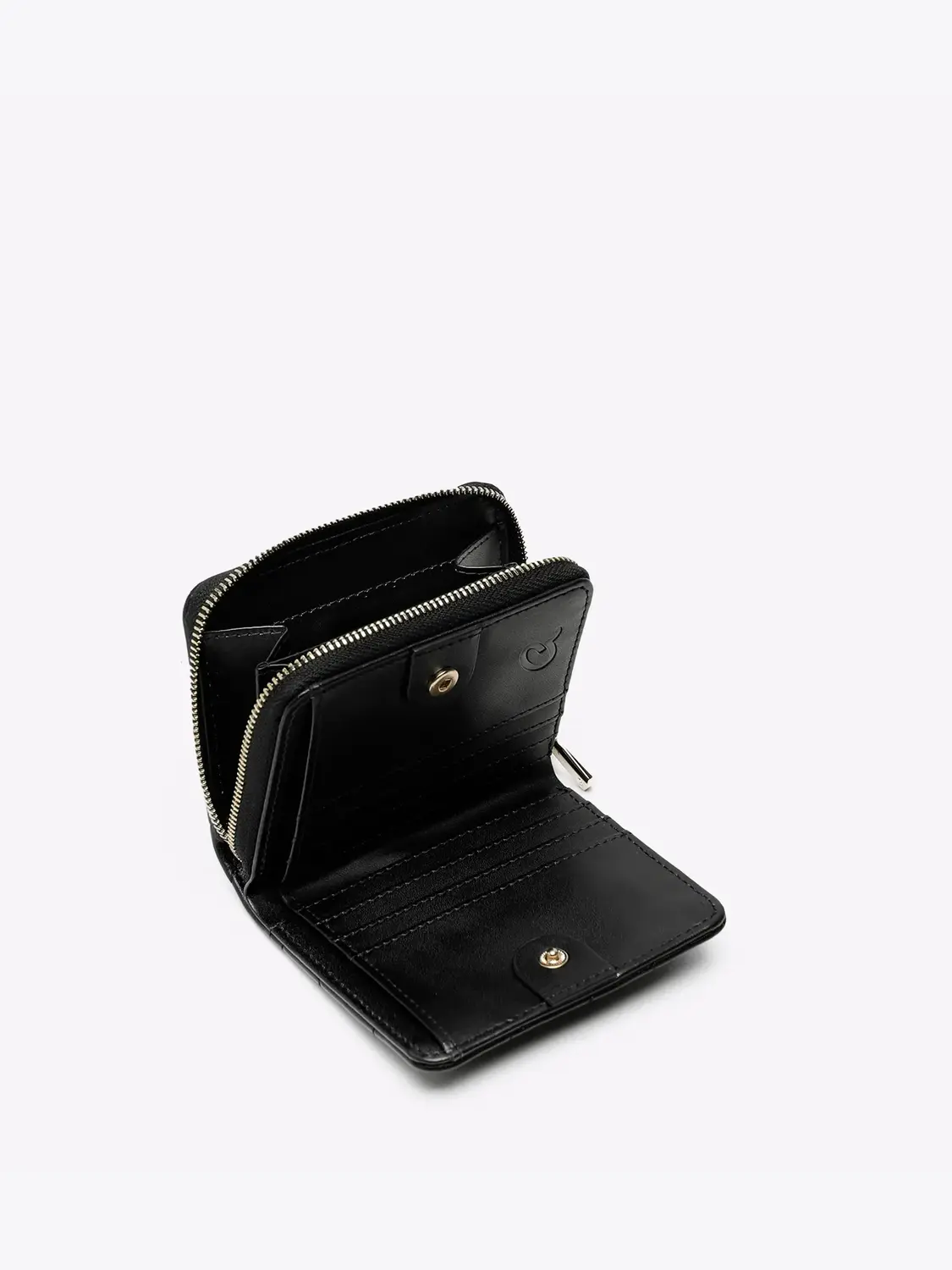 Από τεχνόδερμα με ραφές, με δύο χωριστά τμήματα και θήκες για κάρτες, χαρτονομίσματα, νομίσματα και κινητό. Κλείνει με φερμουάρ και διαθέτει αποσπώμενο λουράκι για χρήση και ως τσαντάκι. Ιδανικό για κάθε μέρα.