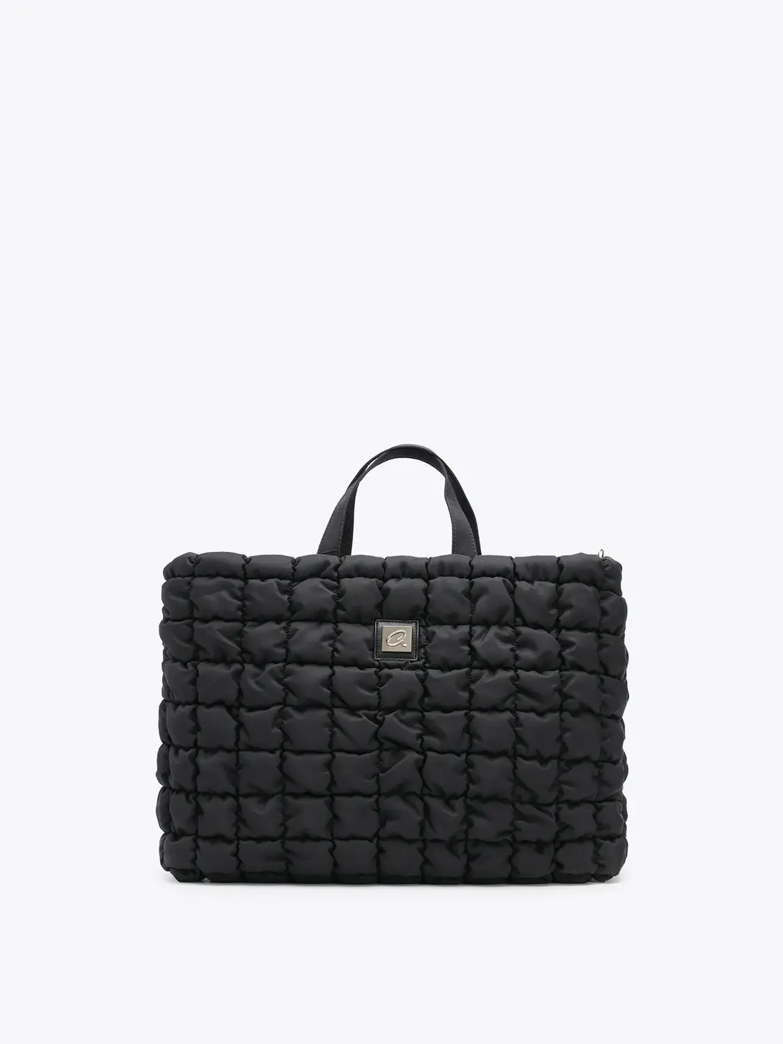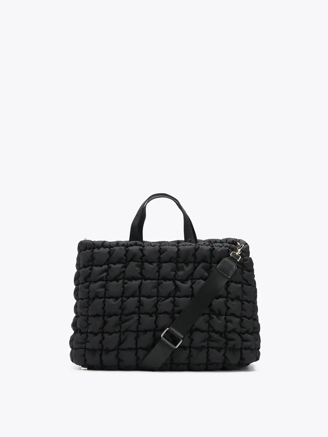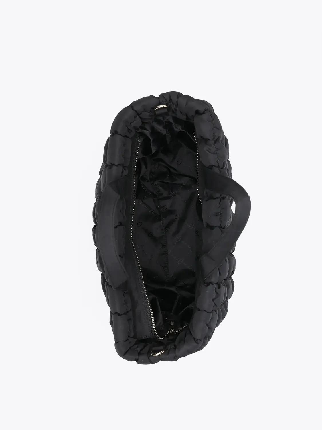 Γυναικεία τσάντα χειρός με καπιτονέ puffer τεχνική Runa, κατασκευασμένη από συνθετικό ύφασμα. Επενδυμένη με φόδρα εσωτερικά, περιέχει μία τσέπη με φερμουάρ και δύο ανοιχτές θήκες για οργάνωση. Διαθέτει κράτημα με διπλά χερούλια και συνοδεύεται από φαρδύ ρυθμιζόμενο ιμάντα για να χρησιμοποιηθεί και ως χιαστί. Με χρυσές μεταλλικές λεπτομέρειες και κλείσιμο με φερμουάρ. Μία πολύ ιδιαίτερη τσάντα για μοντέρνες εμφανίσεις.