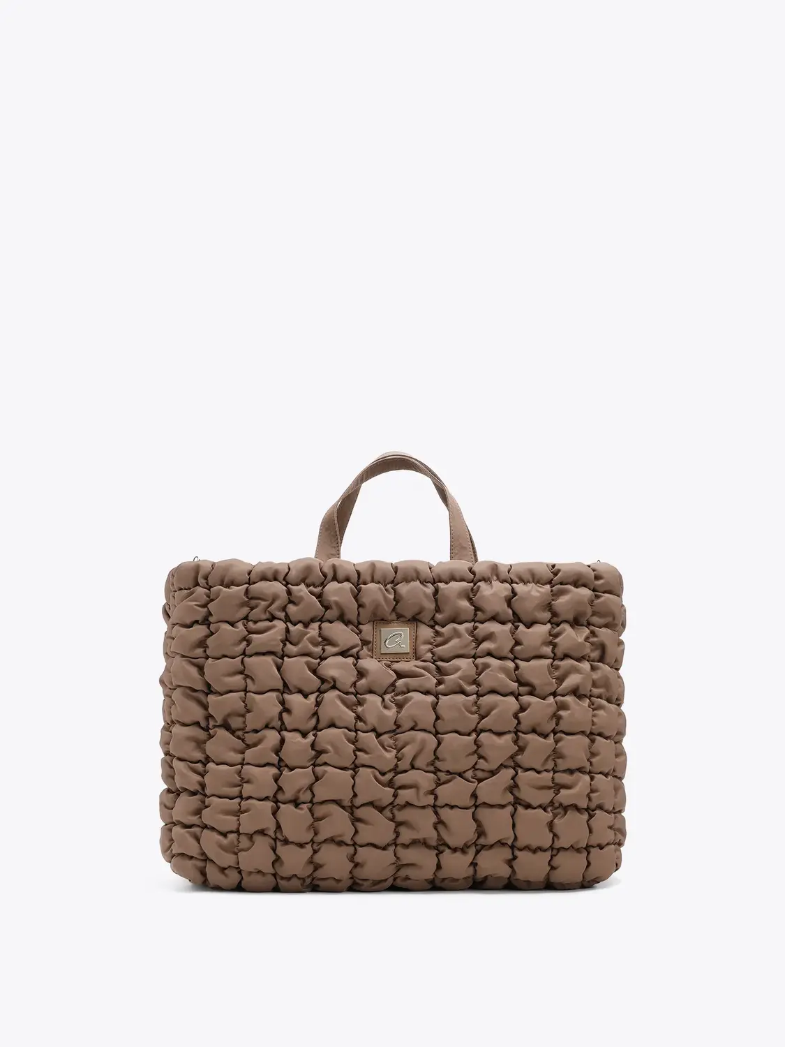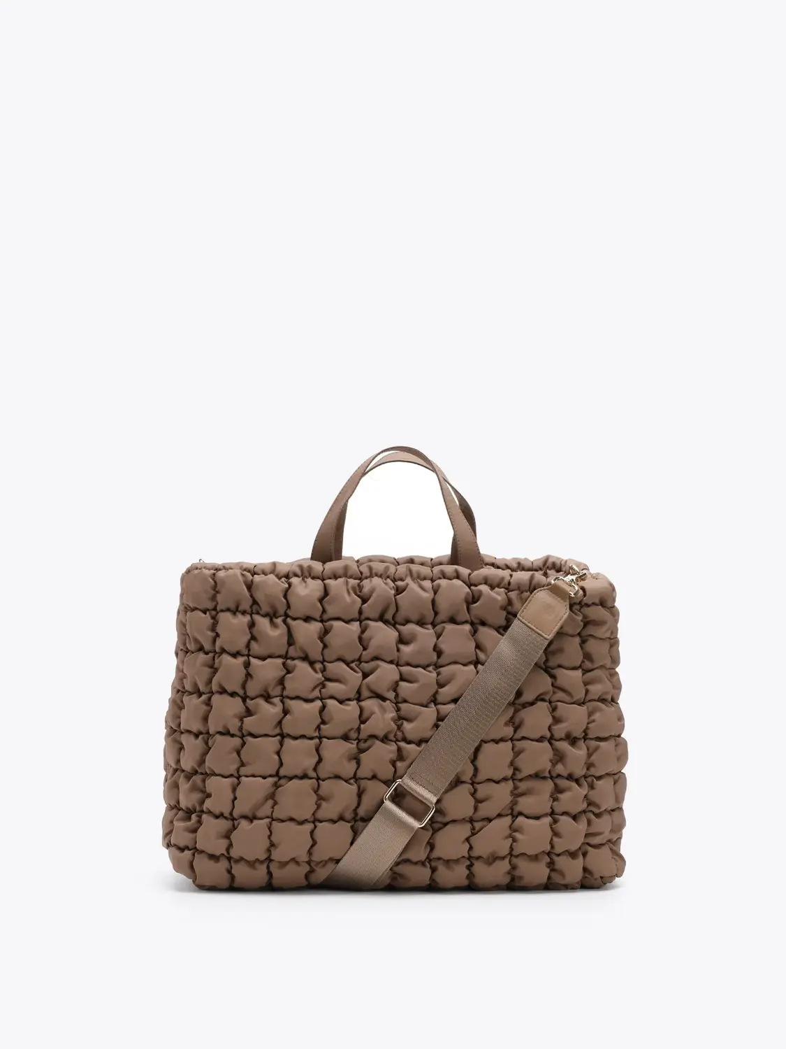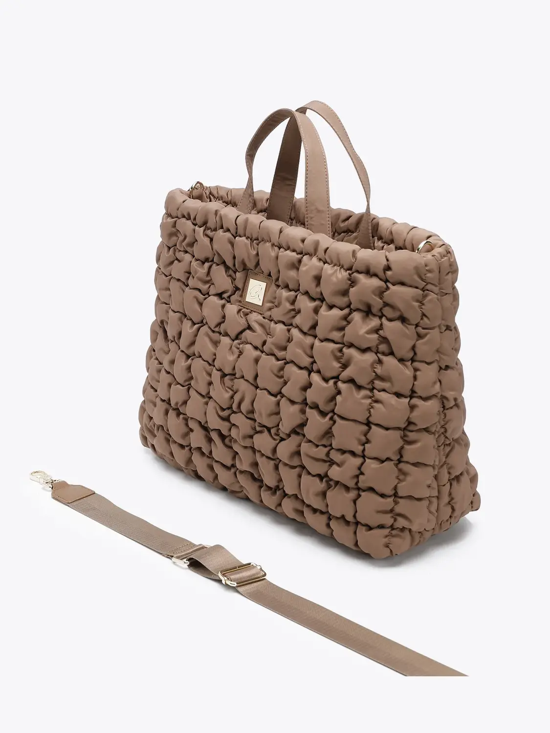 Γυναικεία τσάντα χειρός με καπιτονέ puffer τεχνική Runa, κατασκευασμένη από συνθετικό ύφασμα. Επενδυμένη με φόδρα εσωτερικά, περιέχει μία τσέπη με φερμουάρ και δύο ανοιχτές θήκες για οργάνωση. Διαθέτει κράτημα με διπλά χερούλια και συνοδεύεται από φαρδύ ρυθμιζόμενο ιμάντα για να χρησιμοποιηθεί και ως χιαστί. Με χρυσές μεταλλικές λεπτομέρειες και κλείσιμο με φερμουάρ. Μία πολύ ιδιαίτερη τσάντα για μοντέρνες εμφανίσεις.