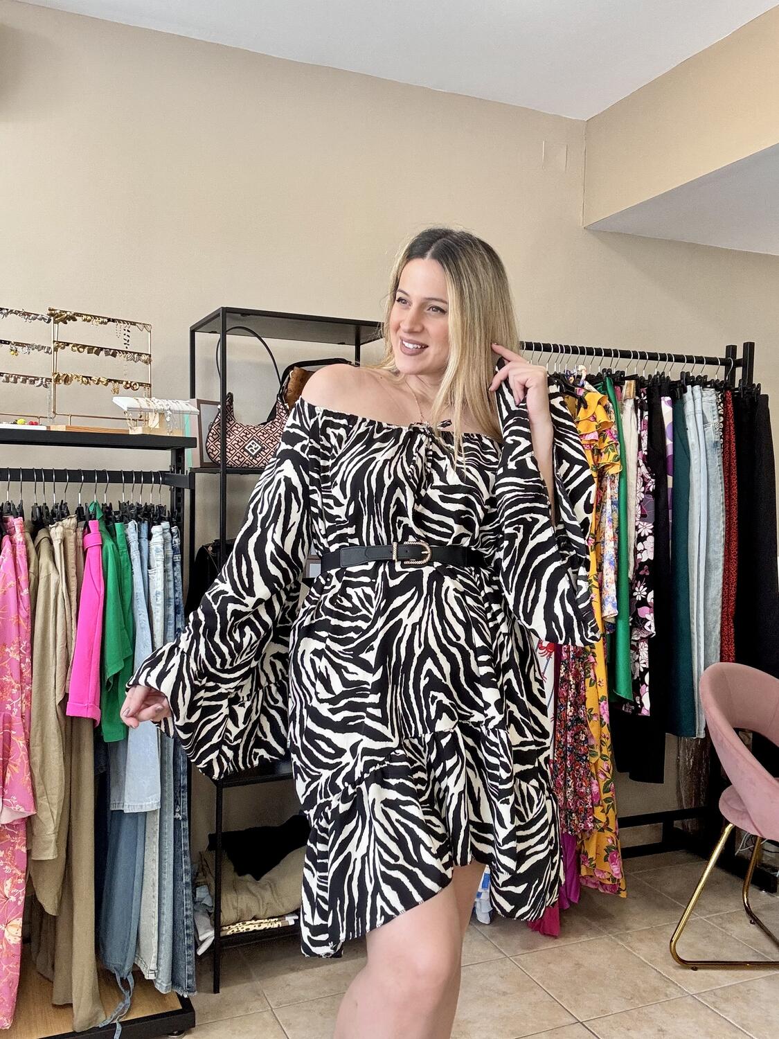 Κοντό φόρεμα ζεβρέ με φραμπαλά στα μανίκια .(η ζώνη πωλείται έξτρα)