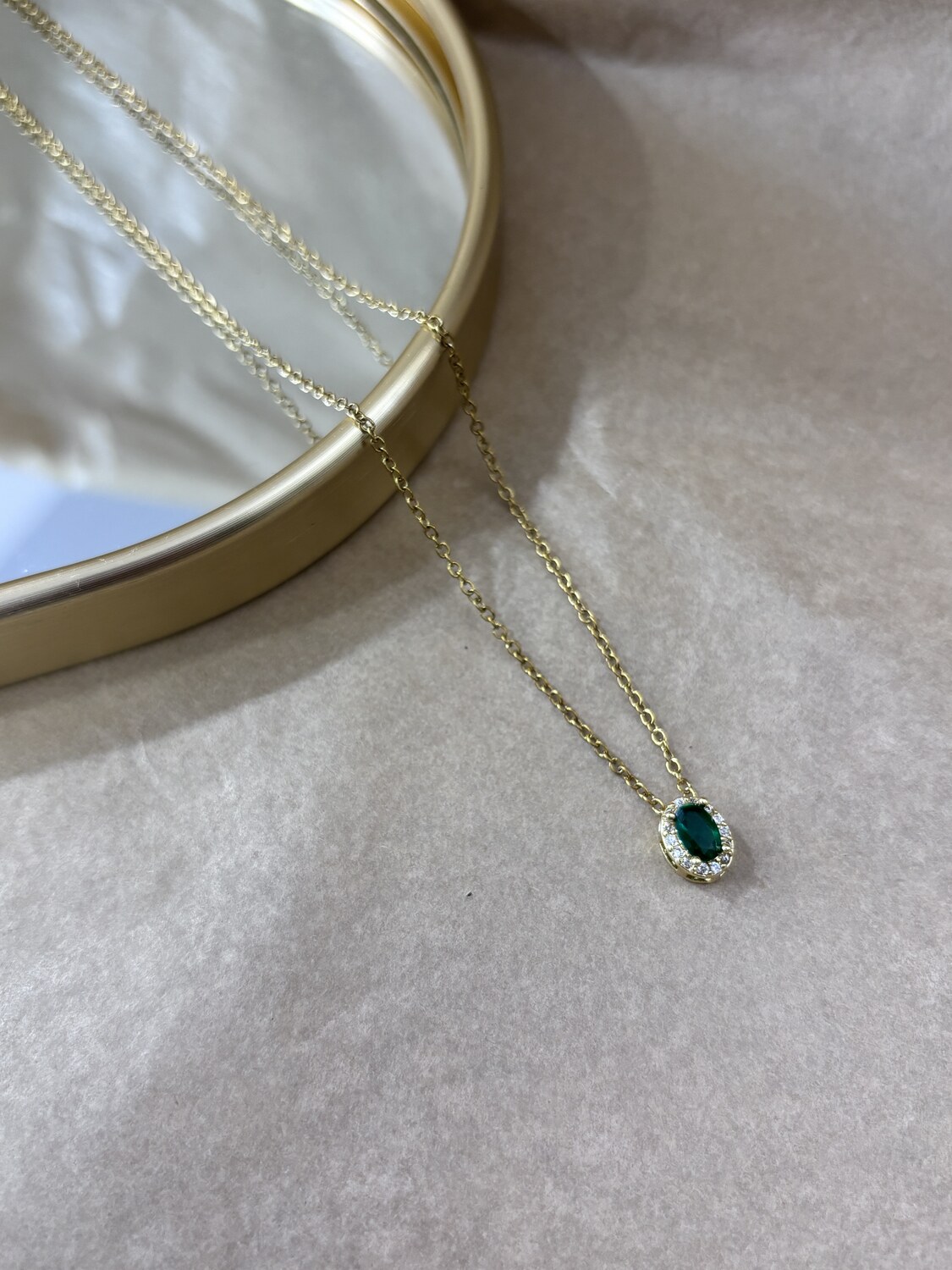 Ατσάλινο κολιέ σε χρώμα χρυσό με πέτρα πράσινη. Δεν μαυρίζει και είναι ανθεκτκό στο νερό.