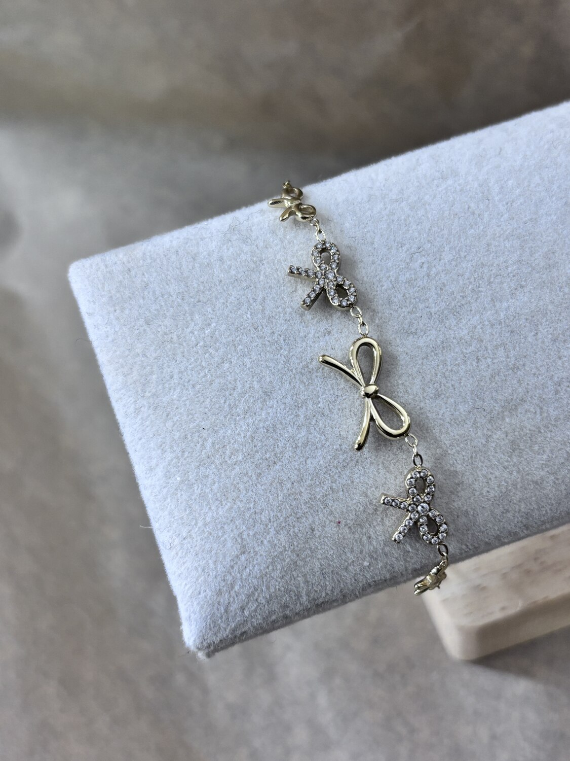 Ατσάλινο βραχιόλι σε χρώμα χρυσό με φιογκάκια. Είναι ανθεκτικό στο νερό και δεν μαυρίζει.